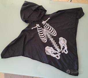 Mantellina nera di carnevale o di halloween in tessuto sintetico con stampato uno scheletro. Per bambini dai 3 ai 6 anni. Usata ma in buono stato. Misure indicative circa 70 cm altezza e circa 100 cm larghezza.