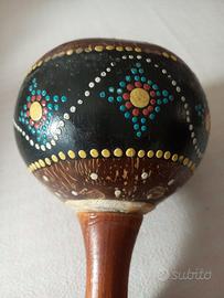 Strumento musicale maracas realizzato e decorato a mano con cassa armonica in cocco e manico in legno. ATTENZIONE: presenta una piccola imperfezione/scheggiatura alla base del manico come da penultima foto. Le maracas producono il loro caratteristico suono per scuotimento: i grani interni picchiano tra di loro e contro la parete interna creando suoni allegri e gioiosi. Lunghezza cm.25, diametro cm.12.