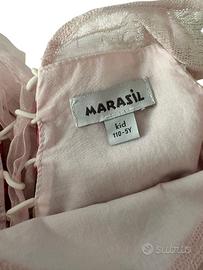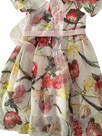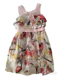 Delizioso abito da cerimonia di Marasil. In tessuto di poliestere, tulle e cotone, stampa floreale all-over. Chiusura con fasce sul retro. Foderato in cotone. Taglia 5 anni. Lunghezza 55 cm, spalle 20 cm, torace 27 cm. Articolo in ottime condizioni, usato solo una volta. Nessun segno evidente di utilizzo o danneggiamento. Senza etichette, nessuna fattura.