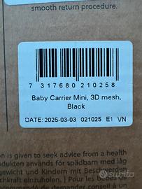 Adatto da 0 a 1 anno •Peso: 3,2 – 11 kg •Tessuto 3D mesh traspirante •Leggero e facilissimo da usare Condizioni: •Acquistato 1 anno fa •Usato con cura •Nessun danno, perfettamente funzionante •Pulito e pronto all’uso Incluso: •Scatola originale •Manuale Perfetto per i primi mesi – molto comodo sia per il bambino che per il genitore.