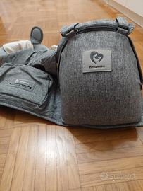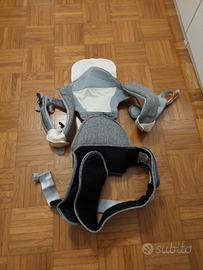 marsupio per bambini adatto anche per gite in montagna. color grigio base rinforzara con supporto, cintura regolabile per allacciarlo in vita imbottita e dotata di piccolo marsupio. spalline regolabili anch'esse imbottite.