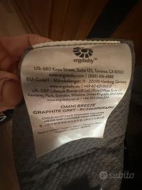 Vendo, per inutilizzo, marsupio per bimbi, marca Ergobaby modello Omni Breeze colore grigio grafite. Marsupio come nuovo, utilizzato 2 volte in tutto. Utilizzabile fino a 20 kg di peso.