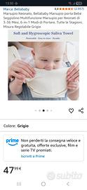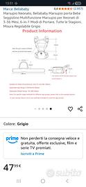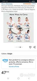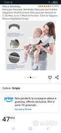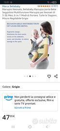 Marsupio con cui è meno faticoso reggere il bambino, poiché è appoggiato su una base spaziosa e resistente allacciata intorno alla vita dell'adulto. Si può usare completo o anche solo la base, per tenerlo in braccio senza pesare su spalle e braccia. NUOVO, colore grigio, completo, fino a 36 mesi di età.