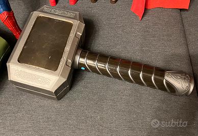 martello giocattolo Thor Lightning Strike Hammer di Hasbro, ispirato al film Thor: The Dark World. Il martello è realizzato in schiuma morbida per il gioco di ruolo. Include effetti sonori e luminosi, con fulmini gialli visibili all'interno della testa del martello. Gli effetti si attivano tramite un pulsante o con il movimento. Funziona con 3 batterie incluse.