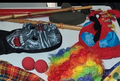 Carnevale: accessori vari come: maschera Halloween, copricapo cilindro con parrucca, 1 maschera solo occhi con piume, 3 oggetti gioco attrezzi indiani, 2 palline trucco copri naso pagliaccio, 2 Machere Hanonymous Troy bianco coprifaccia plastica per trucchi da creare, tutto il lotto in foto , altri dettagli da chiedere in chat.