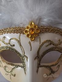 Maschera veneziana decorativa colore bianco e oro con piume, misure nelle foto, piuttosto piccola, adatta per donna o bambina o semplicemente come decorazione complemento d'arredo.