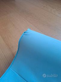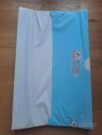 Materassino fasciatoio morbido azzurro 50x80x9cm (lo spessore inferiore, dove appoggia il bimbo è 3cm, le protezioni laterali sono 9cm). Usato solo due volte in una seconda casa. Segnalo la presenza di un piccolo forellino come da foto di 2 mm massimo. Consegna solo a mano.