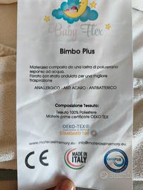 Materasso per culla lettino BIMBO PLUS antisoffoco misura 60x120 cm alto 11 cm con rivestimento sfoderabile e lavabile in lavatrice. Dimensioni del prodotto120L x 60l x 11Gio cm Peso articolo2 Chilogrammi Descrizione consistenza articoloRigido Stile piano di lavoroTight BASE CON FORI PASSANTI TRASPIRANTI: La lastra interna del Bimbo Plus è dotata di fori passanti lungo tutta la superficie, progettati per garantire una costante circolazione dell'aria. La struttura a doppia lavorazione — lato liscio per il bambino e lato ondulato verso il lettino — assicura una traspirazione ottimale e un ambiente di riposo sicuro e igienico. CERTIFICATO UNI EN 16890:2017+A1:2021 E OEKO-TEX STANDARD 100 CLASSE 1: Il Bimbo Plus è testato e certificato secondo la normativa europea UNI EN 16890:2017+A1:2021, lo standard specifico per i materassi da lettino per bambini, che ne garantisce sicurezza, traspirabilità e idoneità all'uso fin dalla nascita. Tutti i materiali sono inoltre certificati Oeko-Tex Standard 100 classe 1, la categoria più elevata per il contatto diretto con la pelle dei neonati. Nessuna sostanza nociva. Made in Italy. RIVESTIMENTO SILVER ANTIBATTERICO ANTIACARO SFODERABILE E LAVABILE IN LAVATRICE: Il rivestimento esterno del Bimbo Plus è trattato con silver