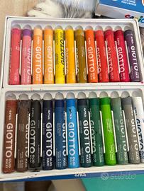 Vendo lotto completo di materiale creativo e scolastico: tempere Carioca, pastelli a olio Giotto, acquerelli, tavolozza, quaderni, raccoglitori, fogli e due libri di ricette per bambini. Tutto in buono stato, ideale per lavoretti, scuola o attività artistiche.