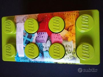 Pratico e resistente contenitore pieno di mattoncini variopinti per stimolare i bambini alla creativitá.