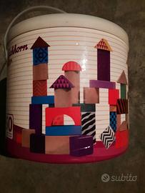 Mattoncini in legno, in diverse forme, realizzati in legno di betulla naturale, ottimi per tutti i bambini e le bambine a partire da 1 anno di età. Il coperchio della scatola ha sei diversi ritagli geometrici per poter incastrare i mattoncini nella confezione divertendosi