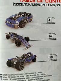 Gioco MECCANO MAKER SYSTEM modello RACE CARS, permette di costruire 5 modelli diversi di auto da corsa, composto da 162 pezzi, due utensili, istruzioni per il montaggio di 3 modelli (per gli altri 2 sono da scaricare dal sito) Adatto dagli 8 anni in poi. Completo di tutti i pezzi, come nuovo.