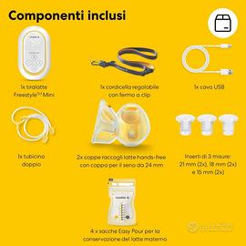 Medela Freestyle Mini Tiralatte Hands-Free Mani Libere Doppio Ricaricabile ARTICOLO SIGILLATO NELLA COME DA FOTO Ultra-leggero, ultra-piccolo: unità motore separata, grande quanto il palmo della mano, e coppe raccoglilatte Hands-free tre inserti aggiuntivi si adattano a oltre il 95% delle misure dei capezzoli. con una batteria ricaricabile integrata che consente fino a 2 ore di estrazione (o fino a 8 sessioni di estrazione) con una carica. le coppe per il seno ad angolo ampio che hanno dimostrato di fornire fino all’11,8% di latte in più facile da montare e pulire grazie ai pochi componenti. Lavabile in lavastoviglie
