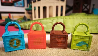 Questo trenino con pista multilivello presenta i luoghi e i personaggi più amati dello show, oltre a una piattaforma girevole, tre gru per caricare e scaricare e la pista dove circolano le locomotive.