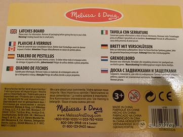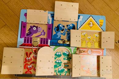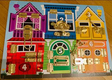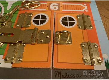 GIOCHI MONTESSORI 3 ANNI - Questo tavolo multiattività bambini firmato Melissa & Doug è un pannello in legno e gioco serrature con disegni divertenti e colorati e con chiavistelli da aprire, sganciare e far scivolare, per un gioco da tavola creativo e stimolante. Serve per sviluppare attività motorie e sensoriali.