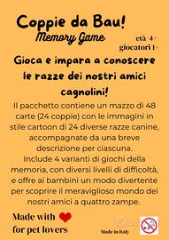 COPPIE DA BAU! GIOCO DI MEMORIA. Il pacchetto è tascabile e contiene un mazzo di 48 carte (24 coppie) con le immagini in stile cartoon di 24 diverse razze canine, accompagnate da una breve descrizione per ciascuna. Include 4 varianti di giochi della memoria, con diversi livelli di difficoltà, e offre ai bambini un modo divertente per scoprire il meraviglioso mondo dei nostri amici a quattro zampe. giocatori 1+ età 4+