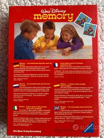 MEMORY Walt Disney, gioco da tavolo prodotto dalla Ravensburger, risalente al 1984. Gioco vintage, educativo di memoria. Include carte con vari personaggi Disney. Bisogna trovare coppie di carte raffiguranti personaggi Disney. Le carte vengono mescolate e posizionate coperte sul tavolo; a turno, ogni giocatore scopre due carte. Se formano una coppia, le tiene e gioca ancora, altrimenti le ricopre. Età 4-8 anni, da 2 a 8 giocatori.