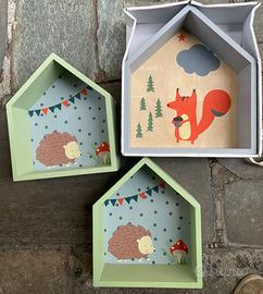 Vendo 3 mensole in legno a casetta con disegni delicati ed adatti sia a camere per bimbi o bimbe.