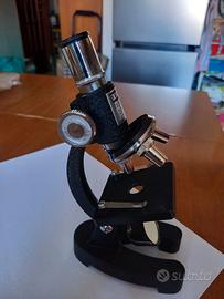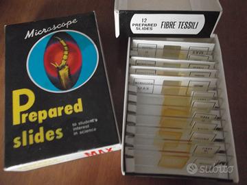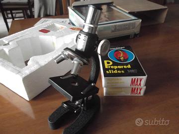 Microspcopio TRCON MAX anni '70, 100/200/300 ingrandimenti, corpo snodabile completamente in metallo, completo di pinzette e 4 vetrini vergini e 1 preparato. Con istruzioni d'uso. Praticamente nuovo in scatola originale. € 15. 2 scatole confezioni MAX da 12 vetrini preparati contenenti vegetali e fibre tessili. Nuovi € 20. Torino: zona corso Belgio.