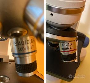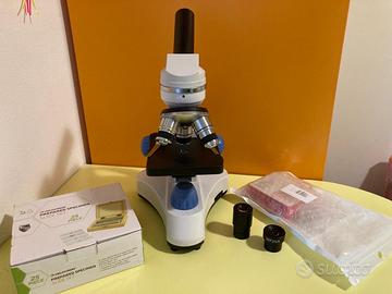 Microscopio con tre obbiettivi. Sono compresi due oculari, un set di 25 vetrini preparati, un set di vetrini trasparenti da preparare e due pipette contagocce.