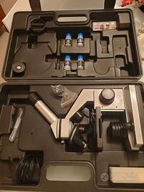 Microscopio Bresser 40x-1024X con oculare elettronico completo e usato pochissime volte praticamente come nuovo. In aggiunta ci sono diversi vetrini di parti di insetto e piante per un'esperienza più entusiasmante.