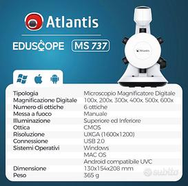 anni. Nuovo, solo aperto e provato. Microscopio Digitale USB Atlantis E45-MS737. Risoluzione UXGA 1600x1200. 6 ottiche di ingrandimento preimpostato da 100x a 600x. Messa a fuoco, Illuminazione superiore ed inferiore. PC, MAC e Android