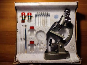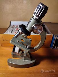microscopio anni 70 ancora funzionante anche con batterie, confezione originale, purtroppo mancano alcuni accessori come pinzetta, vetrino, e bacchettina in vetro (vedi foto)