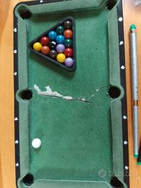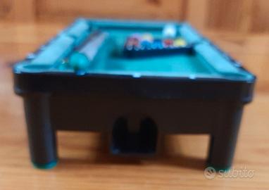 Di seconda mano, da tavolo, anni 90 circa, usato come soprammobile, ideale per taverne. presenta il panno con scoloritura e taglio centrale che si puo' cammuffare con le palline e stecche. cm11,5x20,5xh5 EURO 5,00