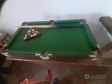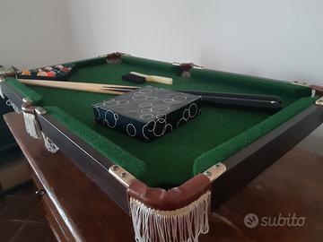 Mini biliardo da tavolo in perfette condizioni. Struttura in legno. Misure cm. 92 x 52. Completo di 15 bilie, 2 stecche di legno, spazzola e triangolo.