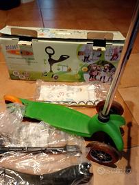 Mini micro green with seat, 1-5 years. Mini micro di colore verde tre funzioni con sedile, maniglia ergonomica e monopattino. Usato ma provvisto di scatola completa di istruzioni e kit di montaggio. Sbeccato su un lato come da foto. Manopola di destra con pomolo incollato. Visto e piaciuto come da allegati fotografici.