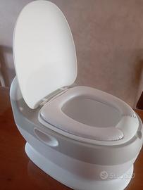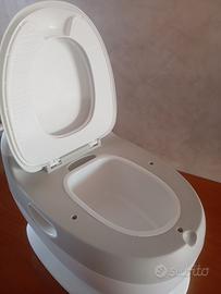 Questo vasino riproduce la forma del water grande. Ha una tavoletta che si solleva , internamente un contenitore removibile. Con un pulsante, alimentato da una pila riproduce perfettamente il rumore dello sciacquone. Il materiale è di plastica dura e resistente, brand AZIAMOR.