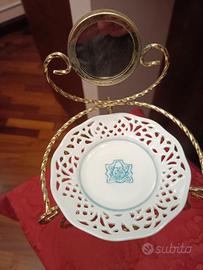 Soprammobile Miniatura tolettina vintage per casa delle bambole con lavabo e specchio in ottone e porcellana, misure cm.23x12, il piattino/lavabo misura diametro cm.10,30, della manifattura Schumann Arzberg Bavaria, fondata nel 1881.La fabbrica ha interrotto la produzione nel 1994, rendendo i pezzi prodotti prima di tale data oggetti da collezione. Ha bordi traforati e decorazione dipinta a mano, prezzo affare 20 euro.