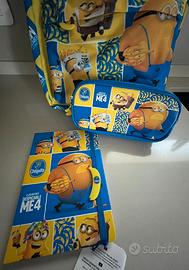Minions set Chiquita composto da zaino, astuccio e quaderno a quadretti con copertina rigida ed elastico tutto con immagini dei Minions. Lo zaino ha 2 maniglie per poterlo portare anche a mano e una tasca con zip sul davanti. Misure zaino larghezza cm 32 lunghezza cm 44 profondità cm 13 circa. L’astuccio ha 2 scomparti chiusi da zip.