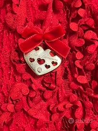 Set Miss Blumarine rosso composto da maglia maniche lunghe con logo su un polso e da abito con lavorazione sul davanti e con cinturina sui fianchi. Taglia 10 anni. Made in Italy. Misure lunghezza 74 cm larghezza 37 cm circa. Nell’ultima foto il piccolo strappo alla fodera interna dell’abito che non si vede quando è indossato. Ottimo per le feste di Natale. Disponibile a inviare altre foto.