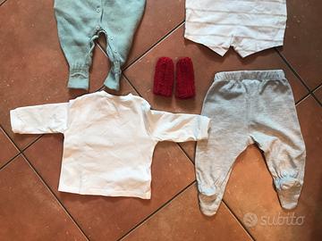 Mix vestiti bombo 0-3 mesi : un paio di guantini neonato in cotone; un paio di copri piedini in lana rossa fatti a mano; una tutina chicco 1 mese 100% cotone; un bodino prenatal 56 cm 1-3 mesi in cotone maniche corte; una cuffietta in cotone; una magliettina mayoral 1-2 mesi in cotone; un pantaloncino Mawi 1 mese in cotone. Tutto in ottime condizioni usato pochissimo / mai usato.