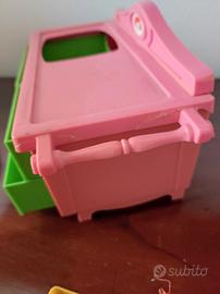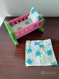 Arredamento vintage anni '70 per casa delle bambole. Letto a dondolo con materasso, cuscino e lenzuolo, tavolo con tovaglia,mobile cucina con lavabo removibile accessori cucina. Mancano i pomelli dei cassetti.