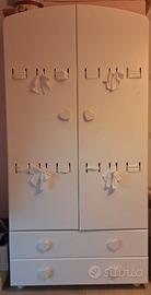Il lettino bianco con orsetto in legno, con tutte le sbarre, materasso, mobile contenitore, libreria e armadio con ripiani in legno marca stokke e fasciatoio con materassino per il cambio con ripiani per ceste marca stokke, armadio in legno bianco marca nanan. I prodotti sono in ottimo stato.