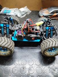 Vendo modello Monster truck himoto scala 1/16 con motore brushless molto potente,fatto vari aggiornamenti nel tempo cui sostituzione telaio in plastica da metallo più vari braccetti e supporti montati nuovi prima della vendita,e applicata anche ventola con dissipatore su motore poiché la usavo con batteria Lipo che va molto veloce e messo olio denso nei ammortizzatori per fare salti,fornisco i ricambi come in foto e anche adattatore per montare batteria Lipo che fornisce molta Potenza e accelerazione in più,fornita anche di caricabatterie e batteria ni-mh, telecomando, e manuale del produttore con esploso ricambi che si trovano a pochi euro online e su AliExpress e scatolo originale