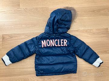 Monclaire Blu, stile bimberino, con cappuccio e pelo completamente staccabile. Comosissima chiusura a bottoni con due diverse misure. Coulisse in fondo. Taglia 3 ma veste momto abbondante. Molto bello e tenuto molto bene.