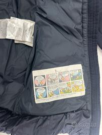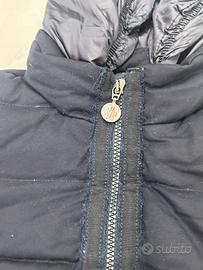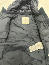 Piumino Moncler originale per bambina di 5 anni. - Colore blu scuro. - Cappuccio integrato. - Chiusura con zip frontale. - Logo Moncler sulla manica.