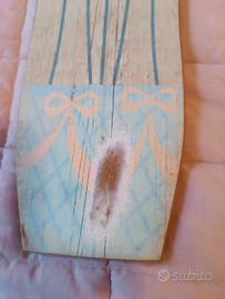 In legno, decoro mongolfiera, altezza 60 cm. Presenti i ganci per appenderla sul retro, ma può essere usata anche d'appoggio. Ottimo stato, segnalo difetto nella parte bassa del decoro (vedere ultima foto per dettaglio).