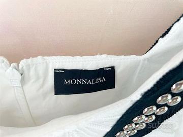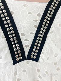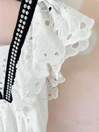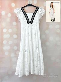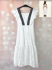 ABITO DA BOUTIQUE COME NUOVO A OLTRE META' PREZZO! Taglia: 12 ANNI Lo stile lo rende perfetto sia per cerimonie ma anche per occasioni più informali. Dettagli: -pizzo laserato -fodera in mussola -maniche a gale verticali -inserto a V a contrasto con borchiette -longuette -100% cotone Lunghezza da spalla al fondo 105 cm
