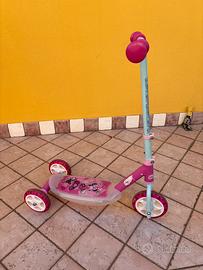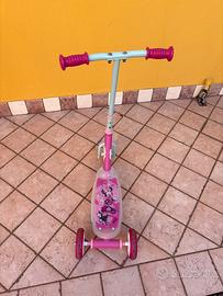 Vendo simpatico monopattino a tre ruote (una anteriore e due posteriori) ideale per bambine che stanno imparando a stare in equilibrio. Il design è ispirato a Minnie, con colori vivaci sui toni del rosa e dell'azzurro pastello. Caratteristiche principali: Stabilità massima: Grazie alle due ruote posteriori, è perfetto come "primo monopattino" per garantire sicurezza e facilità di utilizzo. Impugnature ergonomiche: Manopole in gomma antiscivolo fucsia per una presa salda. Pedana antiscivolo: Base ampia con grafica Disney Minnie ancora ben visibile. Struttura robusta: Telaio in metallo resistente. Stato dell'oggetto: Il monopattino è usato ma in buone condizioni generali. Presenta alcuni normali segni di usura (piccoli graffi sul manubrio e sulle ruote, come visibile in foto) che non ne compromettono affatto il funzionamento. È stato pulito e igienizzato, pronto per una nuova piccola proprietaria!
