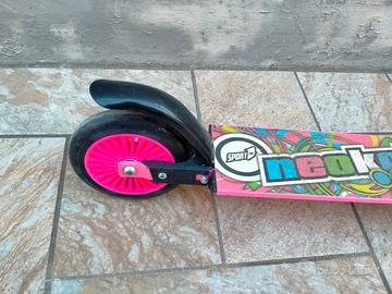 Monopattino per bambina 3/6 anni, rosa fucsia con fantasia. Richiudibile come visibile da foto. Pedana antiscivolo, manubrio regolabile in altezza, freno posteriore a pressione, impugnature ergonomiche. In buone condizioni, perfettamente funzionante.
