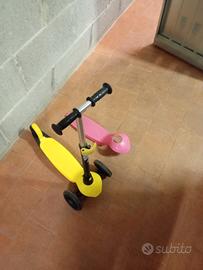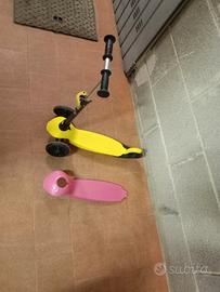 monopattino per bambini dai 2 anni in su alti tra 80 cm e 115 cm. tenuto bene con doppia scocca una gialla una rosa .