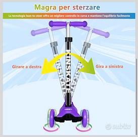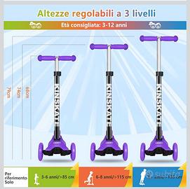 Monopattino Bambino 3 Ruote con Ruote Illuminate a LED Multicolore, Monopattini con Impugnatura Regolabile in Altezza per Bambini e Bambine Dai 3 ai 12 Anni