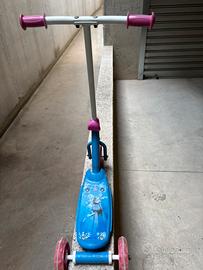 Monopattino per bambini con grafica Disney Frozen (Elsa e Anna), colore blu con dettagli rosa. Dotato di tre ruote per maggiore stabilità, manubrio bianco con impugnature rosa. Usato ma in buone condizioni, ideale per bimbi dai 2 ai 5 anni.
