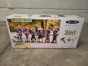 Vendo Mini Micro 3in1, il pluripremiato monopattino progettato per crescere insieme al tuo bambino. È il compagno ideale per sviluppare equilibrio e coordinazione in totale sicurezza fin dai primi passi. Il set è versatile e si trasforma in tre configurazioni diverse: Fase 1 (12+ mesi): Con comodo sedile e manubrio a "O" (ideale per i più piccoli). Fase 2 (24+ mesi): Rimuovendo il sedile, diventa un monopattino con manubrio basso a "O". Fase 3 (3-5 anni): Sostituendo il manubrio a "O" con quello a "T" (incluso), diventa il classico e amatissimo Mini Micro. Caratteristiche principali: Colore: Verde vivace. Peso massimo: Fino a 20 kg (con sedile) / 50 kg (come monopattino standard). Sicurezza: Ruote in poliuretano di alta qualità e pedana antiscivolo rinforzata. Meccanismo: Sterzo intuitivo tramite inclinazione (lean-to-steer). Condizioni: Ottime condizioni / Come nuovo