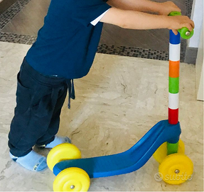 Monopattino con struttura robusta, quattro ruote in plastica che garantiscono sicurezza e stabilità del bambino. Il manubrio con protezione di metallo sui lati, sterza in entrambe le direzioni.