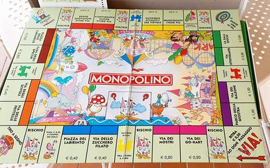 Vendo Monopolino, versione junior del gioco Monopoli, in scatola originale. Buone condizioni, con plancia, pedine, dadi, istruzioni e monete (alcune monetine sono andate perse e sostituitrida altre di cartone con il numero disegnato).